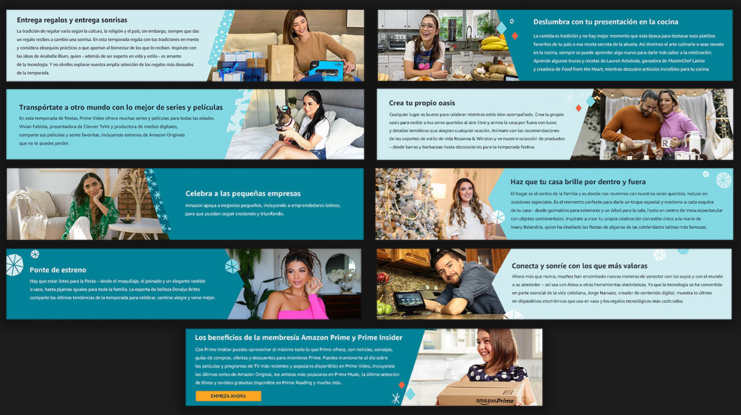 The core of the campaign was a highly scalable influencer framework. We collaborated with a wide array of Latino creators, each serving as the 'curator' for a specific lifestyle category. I directed the creation of dedicated landing pages for each partner, ensuring that every creator’s personal brand felt authentic while remaining anchored to the broader Amazon Fiestas identity. This strategy moved beyond traditional advertising, leveraging the 'halo effect' of community leaders to drive high-intent shopping in a way that felt personal and peer-to-peer.